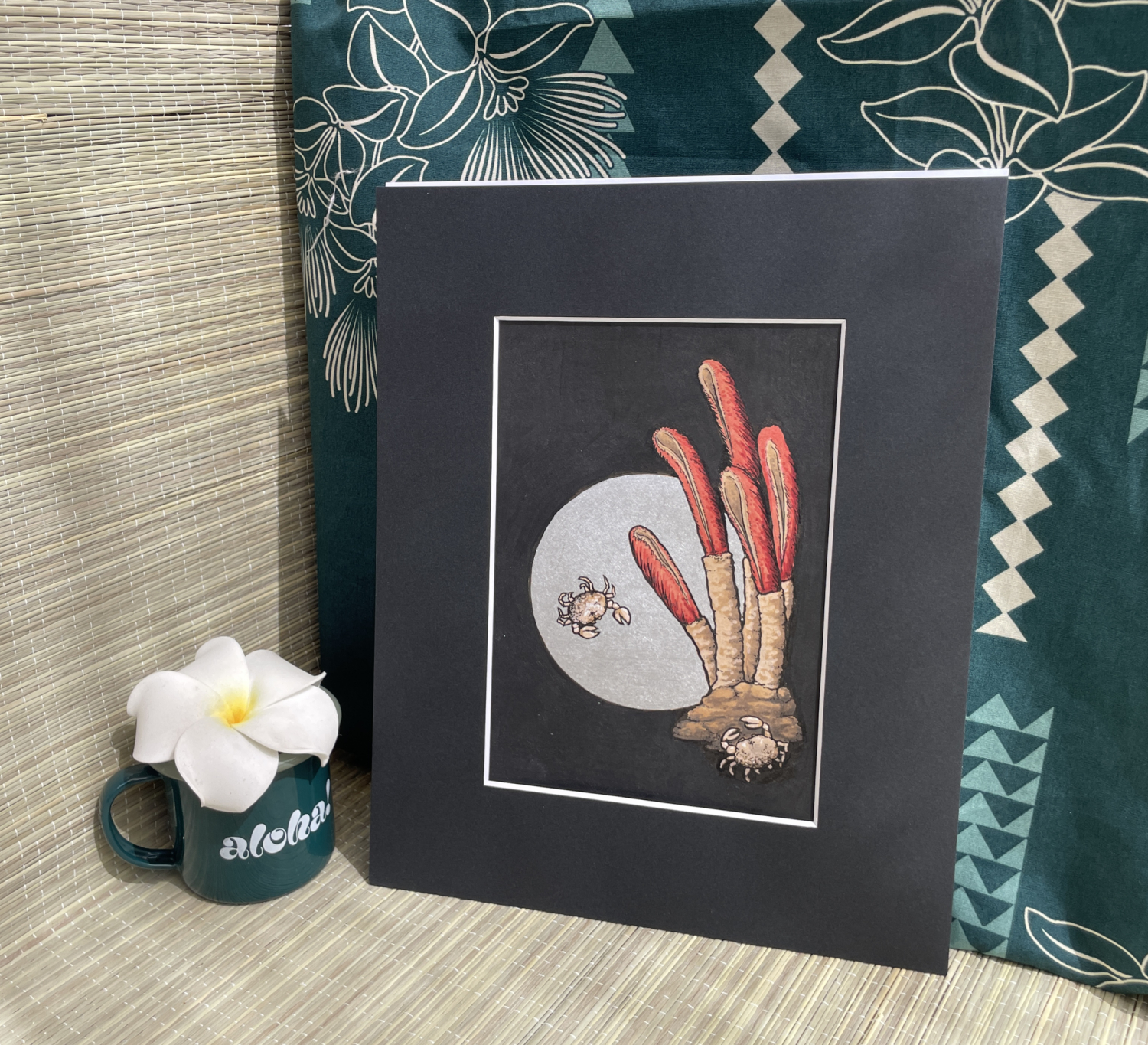 Original illustration. 5x7 matted to 8x10. Ink, metallic oil medium on card.