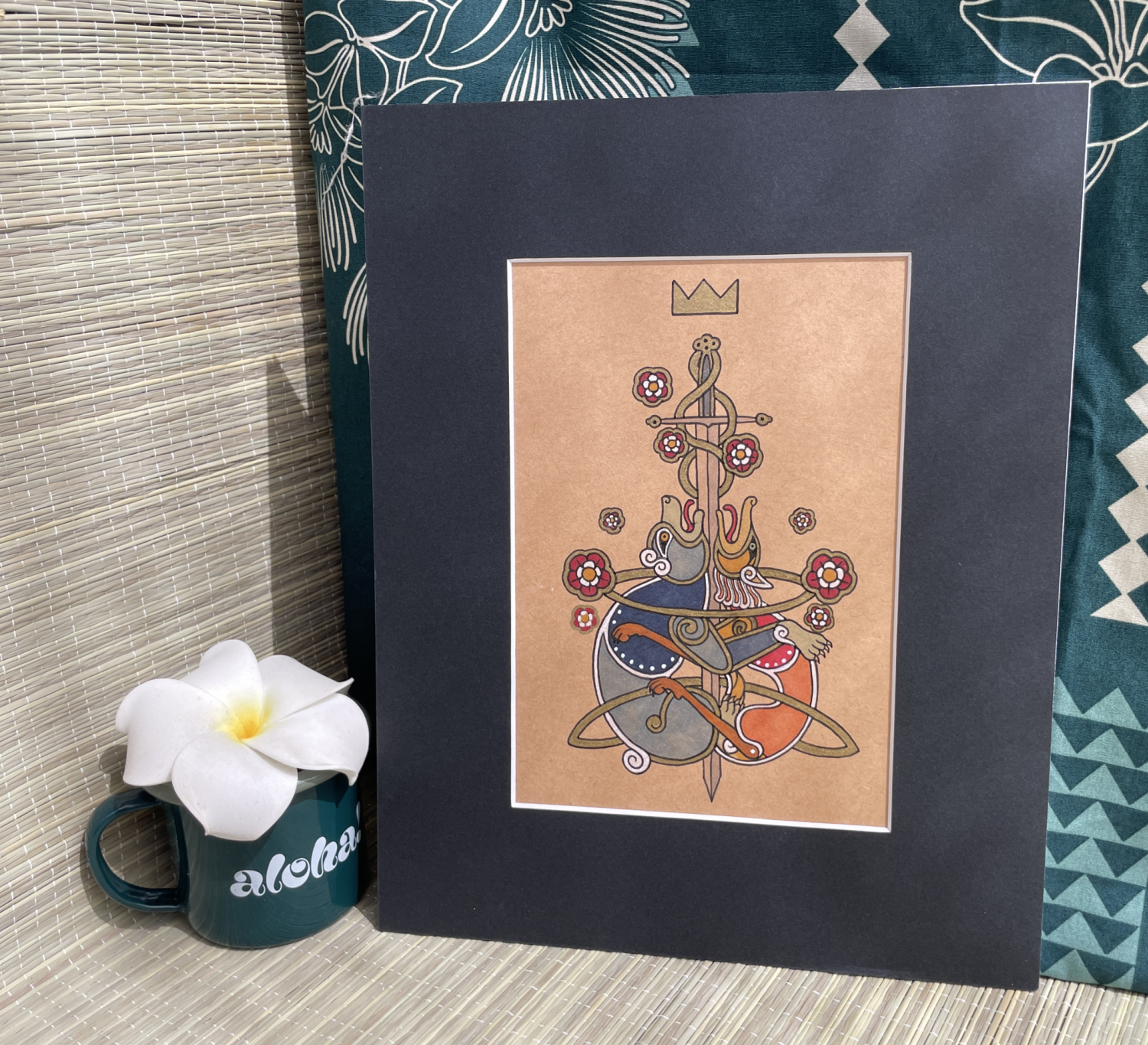Original illustration. 5x7 matted to 8x10. Ink, metallic oil medium on card.