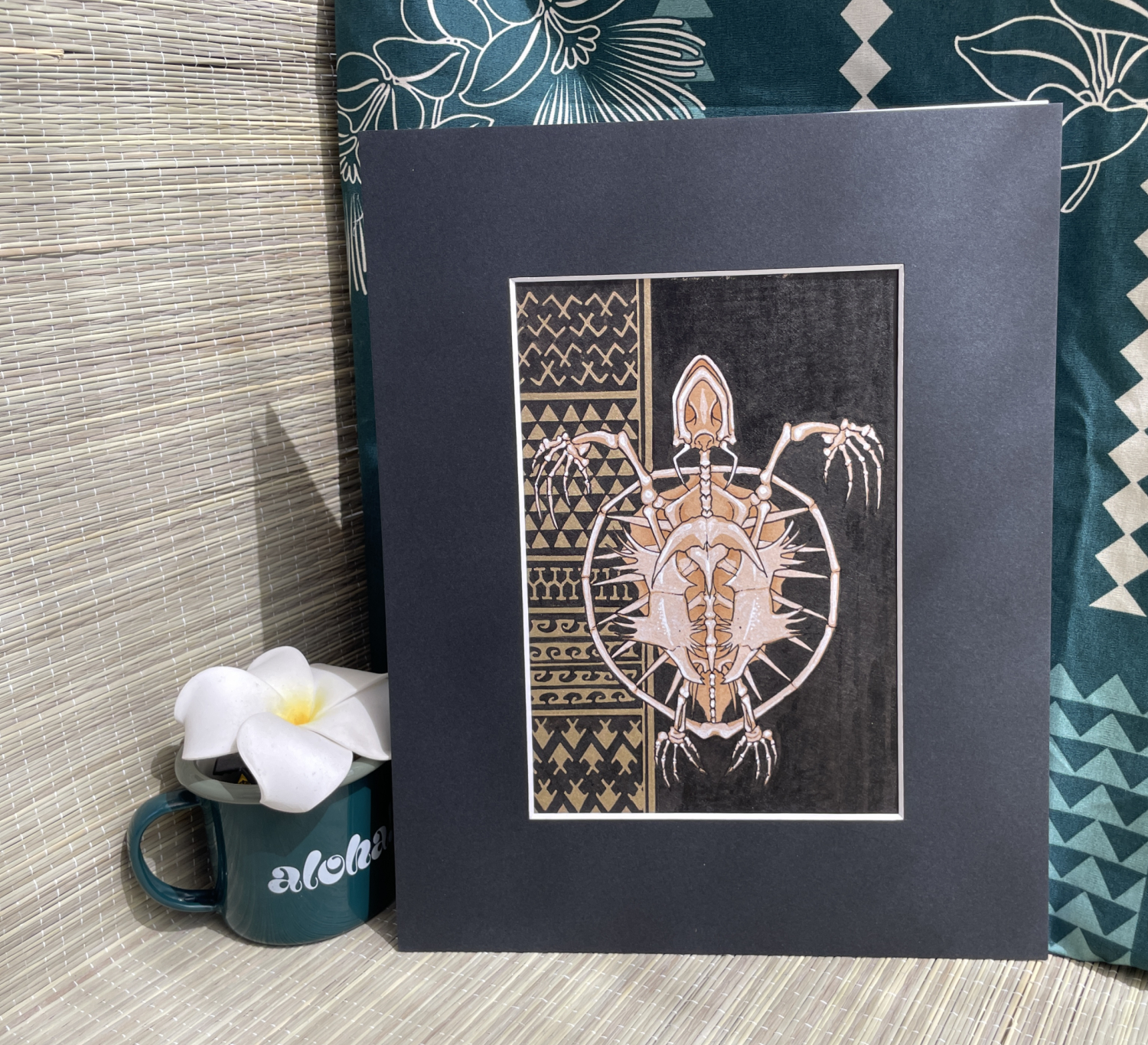Part of the endangered species series the skeleton of a sea turtle augmented by Polynesian designs.